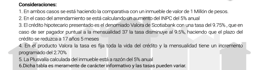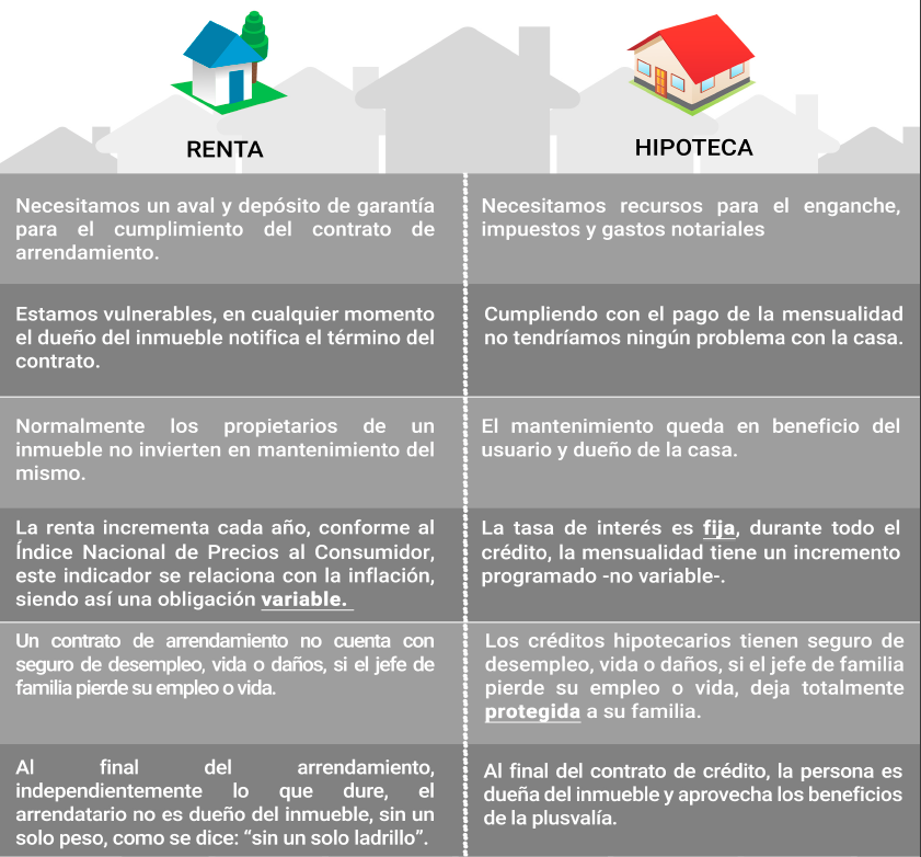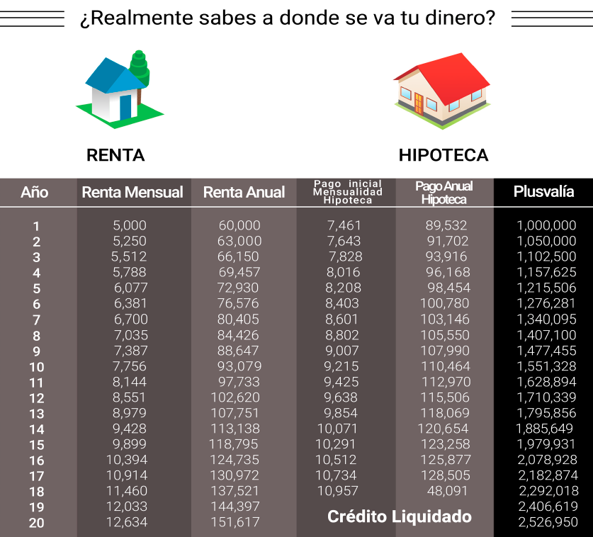 Qué me conviene mas: RENTAR o COMPRAR Robert Kiyosaki, es sin duda un referente obligado en Finanzas Personales. Autor de más de una docena de libros, uno de ellos: Padre Rico, Padre Pobre, ha convencido a muchas personas para cambiar sus creencias relativas a generar riqueza y manejo de dinero. En su libro Padre Rico, Padre Pobre; capítulo 3, titulado: ¿ Por qué enseñar especialización financiera?, plantea que el inmueble que habitamos no es un activo o una inversión. En razón que dicho inmueble solo genera obligaciones - Pago hipoteca, mantenimiento, impuesto predial, entre otros-. Considera, un inmueble es una activo o una inversión cuando genere ingresos. Pero conseguirlo es prácticamente imposible, a menos que pongamos en renta una de las habitaciones para un estudiante o una fórmula equivalente de actualidad. Estoy de acuerdo con Kiyosaki en el hecho que debemos generar la mayor cantidad de activos y mantener nuestro gasto muy controlado. Sin embargo, la realidad es que tenemos un inmueble en donde vivimos cómodamente con nuestra familia de acuerdo con nuestras necesidades y posibilidades. Al respecto, he tenido conversaciones con fanáticos de Kiyosaki. Algunos ya rentan un inmueble, para no gastar en la adquisición de un inmueble, por no considerarlo una inversión; como ya dijimos, es porque ese bien no genera ingresos. Si analizamos la situación de rentar un inmueble, desde su contratación, tiene varias implicaciones y requisitos; así mismo es el de contratar un crédito hipotecario. Para mayor claridad de estos dos aspectos rentar o comprar, se establece el siguiente esquema para establecer sus diferencias. La explicación de una persona que renta un inmueble es que el pago de la renta es mucho mas bajo que el pago de una hipoteca. En Salud Patrimonial se analizaron las diferentes variables a fin de determinar qué tan cierta es esa creencia. ![]() Elaboramos una tabla comparativa del comportamiento de la inversión inicial, pago mensual, pago total y sobre todo el desenlace despues de 20 años de haber pagado una renta o mensualidad por un inmueble. ![]() ![]() Del análisis realizado derivaron las siguientes conclusiones: 1. En el inicio la mensualidad en la renta es más baja que la del crédito hipotecario. Pero al paso del tiempo las mensualidades se van igualando, y al final del plazo, la mensualidad de la renta aumenta considerablemente en comparación con la del crédito hipotecario 2. En el arrendamiento el incremento de la renta, está condicionado al aumento del Índice Nacional de Precios al Consumidor que al estar ligado a la inflación es un componente variable, en este ejercicio sólo se programó un aumento del 5% anual, que es muy parecido al comportamiento quye ha tenido en esta época de estabilidad; sin embargo, nadie puede garantizar que en 20 años este factor se mantenga en estos niveles, en un crédito hipotecario la tasa es fija y el compromiso firmado ante el Banco, no sufre ningún tipo de variación. 3. Con el producto Valora de ScotiaBank, si se paga puntualmente la hipoteca, la tasa de interés disminuye y el plazo del crédito puede reducirse, liquidando el crédito anticipadamente. 4. Podemos apreciar en el comparativo de Total Pagado, hay una ligera diferencia en lo que pagarímos de un crédito contrao el pago de rentas que es de $164,185.40, ya sumando en el caso de la hipoteca el enganche, gastos notariales y demás comisiones. 5. El hecho que un crédito hipotecario cuente con seguro de vida, daños y desempleo, hace que en caso de que un jefe de familia tenga un infortunado acontecimiento, su familia queda protegida y con un "techo seguro", lo que no pasaría si se estuviera rentando un inmueble. 6. El beneficio obtenido después de 20 años, si compramos a crédito el inmueble, es muy importante y tiene una repercusión significativa en el Patrimonio de las personas que deciden este esquema, porque en un escenario realista, al final del plazo estas personas contarán con un inmueble que solo por plusvalía tendrán un valor de más de 2.5 Millones de Pesos. Felipe Basurto Torres es Fundador y Director General de Salud Patrimonial, su principal objetivo es ayudar a sus clientes y colaboradores a cumplir a la brevedad sus objetivos; especialmente, los patrimoniales. Encuentralo en: fbasurto@saludpatrimonial.com Inscríbete a nuestro newsletter y recibirás Contenido Estratégico de Crédito Hipotecario y Generación de un Patrimonio Saludable, haz click aquí. Si te interesas por recibir información de nuestros servicios o unirte a nuestro equipo de trabajo envínos un correo a: ventas@saludpatrimonial.com ¡Siempre a tus órdenes! Elabora un diagnóstico de tus necesidades sin costo para tomar una decisión inteligente y generar Patrimonio Saludable. Solicitar Diagnóstico |